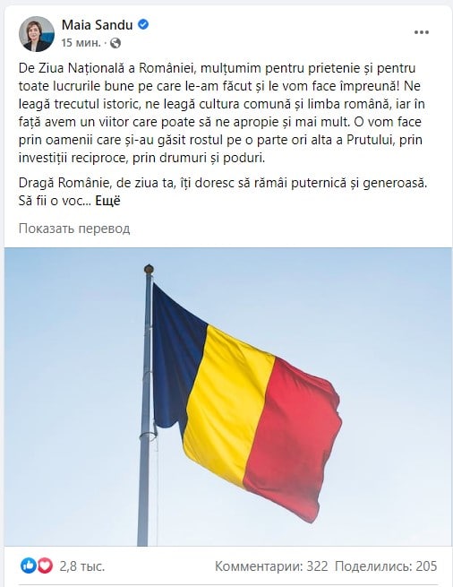 ▪️В своем поздравлении в соцсетях Майя Санду сообщила, что Молдову и Румынию многое связывает в прошлом и многозначительно заметила, что в будущем они станут "еще ближе".